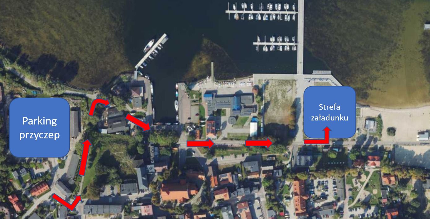 Celem usprawnienia załadunku po regatach, udostępniony zostanie dodatkowy plac na pakowanie sprzętu - zielona plaża za Surf Barem. Aby ograniczyć liczbę pojazdów w porcie, prosimy o kierowanie się samochodami z przyczepami bezpośrednio z parkingu na wyznaczony plac zgodnie z załączonym obrazkiem.